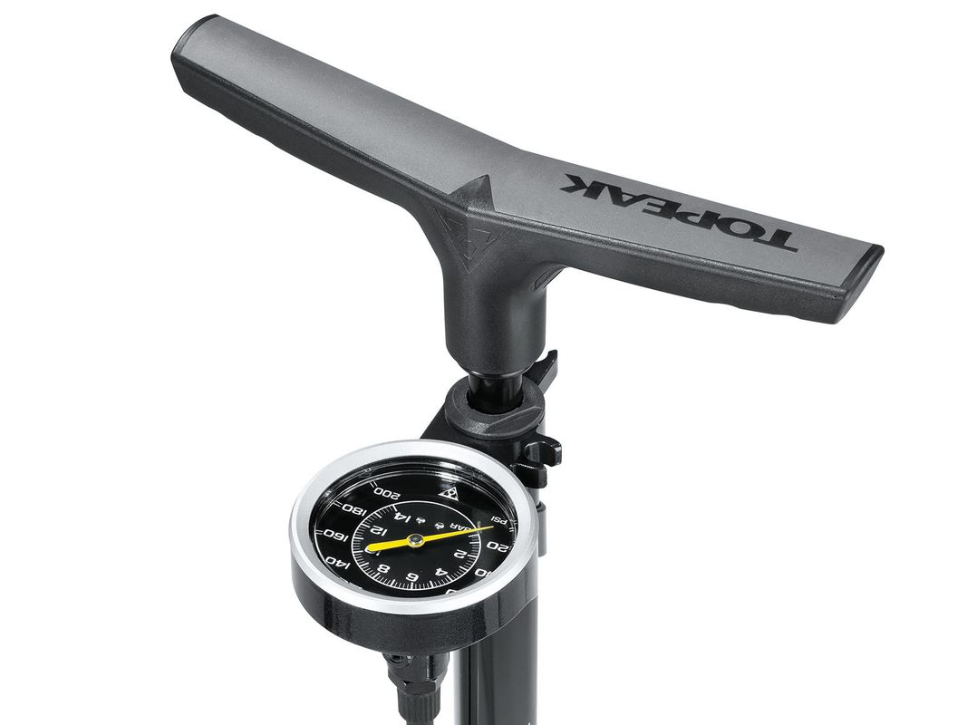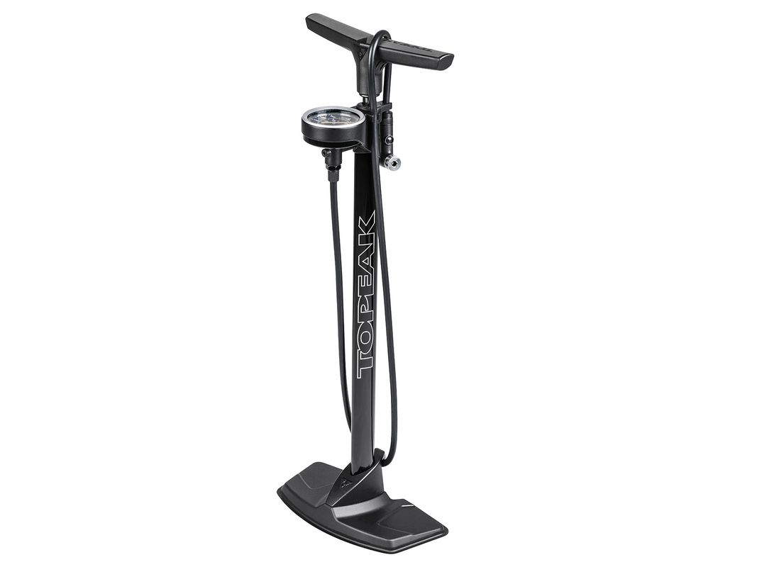 The aero-shaped barrel and wide steel base provide stability when pumping and the 3” top mounted gauge is easy to read up to 200 psi (14 bar). The large padded handle provides comfort while the extra-long and tangle-free hose can even reach wheels on bikes mounted in a stand. The SmartHead® DX3 with lower profile air release button automatically adjusts to fit either Presta or Schrader valves and makes getting the right pressure a simple task.