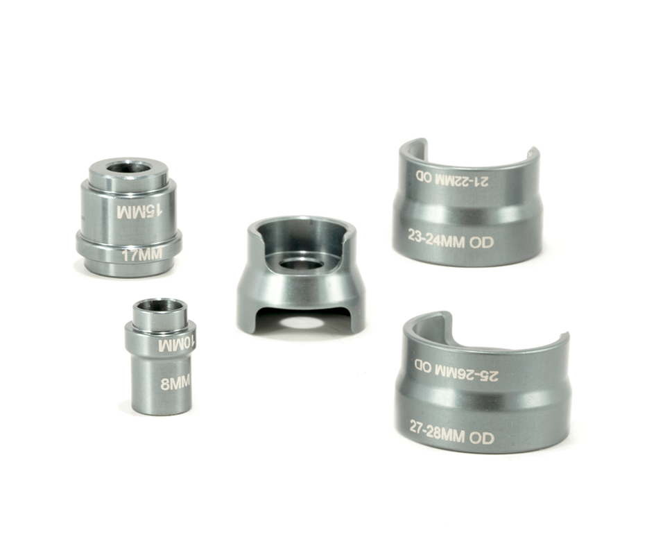 This tool set is designed to remove bearings within suspension linkages and frames. The pilot locates on the inner race of the bearing, and drives the bearing into the extraction cup. This set is compatible with the BRT-050 short and medium rod lengths. The extraction set is also compatible with the BRT-005 bearing press. This set contains 5 pieces, 2 pilots to locate on 8, 10, 15, 17mm inside diameters and 3 extraction cups for 12-28mm outside diameters.