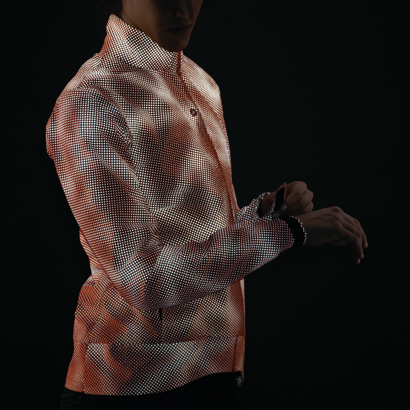 This is the Castelli of commute jackets, made to deliver maximum function on the bike and then look great when you get to work. We wanted a jacket that provides maximum visibility during those night commutes but doesn't look ridiculous with all kinds of silver reflective bands and strips when you get to the office. We applied a nearly unnoticeable reflective print on the entire surface of the jacket. You don't really see it when you're riding in the daytime or wearing the jacket off the bike, but at night the jacket reflects a distinctive pattern to get you noticed. We didn't stop at the reflectivity. The 20,000 mm water column means no water is coming through, ever. And the 20,000 MVTR breathability means that a good amount of moisture will escape. But it's the ventilation details that make this jacket stand out: there's a gaiter at the waist that you can close to seal out the wind or leave open to let some air come in from the bottom to keep you cooler. This inner gaiter allows us to make a jacket that hangs straight at the bottom — a much cleaner and more refined look than a jacket with wrinkles from an internal elastic.
