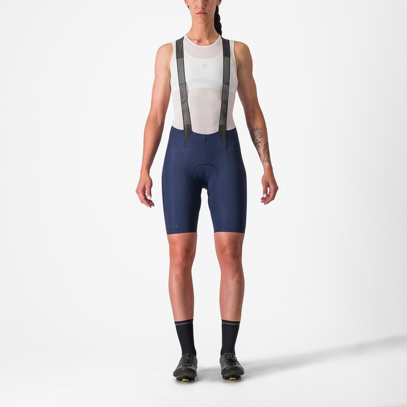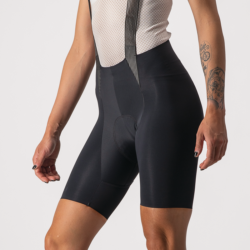 INNOVATIVE EVOLUTION The Free Aero RC Bibshort is our top race short, which also means that it's insanely comfortable even if you never pin on a number. It's fair to say that we've been working on this short for the past 15 years. That's how long it's been since the original Free Aero Race Bibshort was first introduced, initially as our top-of-the-line race short. The various versions of the Free have dressed all our pro women's teams over this time, and it also became the best-selling women's short in the history of Castelli because, simply put, this is the short that does everything well. The concept is quite simple: start with the best pad we know how to make, surround it with a supportive short with good muscle compression, and then remove everything else that's not absolutely necessary. You feel Free thanks to the reduced number of panels and the reduced number of seams. In fact, the short portion has just 5 panels compared to 10 in the previous generation. You feel Free because of further refinements to the Progetto X2 Air seamless seat pad. The two densities of foam plus the gel pads provide progressive damping, while the separate Skin Care Layer is soft and stretchy to move with your skin. You feel Free thanks to the most minimal bibs you've ever seen in a short, including open-weave straps for maximum airflow. But we reinforced the yoke so the straps stay in place and made the mesh back narrow for coverage that is minimal yet just enough to hold the shorts in place. And the bib elegantly frames a convenient pocket at the center back. You feel Free because this is the first high-end short that doesn't need any sort of gripper or elastic at the end of the leg to keep the leg in place. Getting this right meant 28 prototypes and our most extensive test program ever, and it results in the most comfortable leg ending we've ever made. The Forza 2 fabric has 32% Lycra® with a high modulus for exceptional muscle support and just the right amount of compression. There's reflective piping on the back. And all logos are either stitched or embossed for durability.