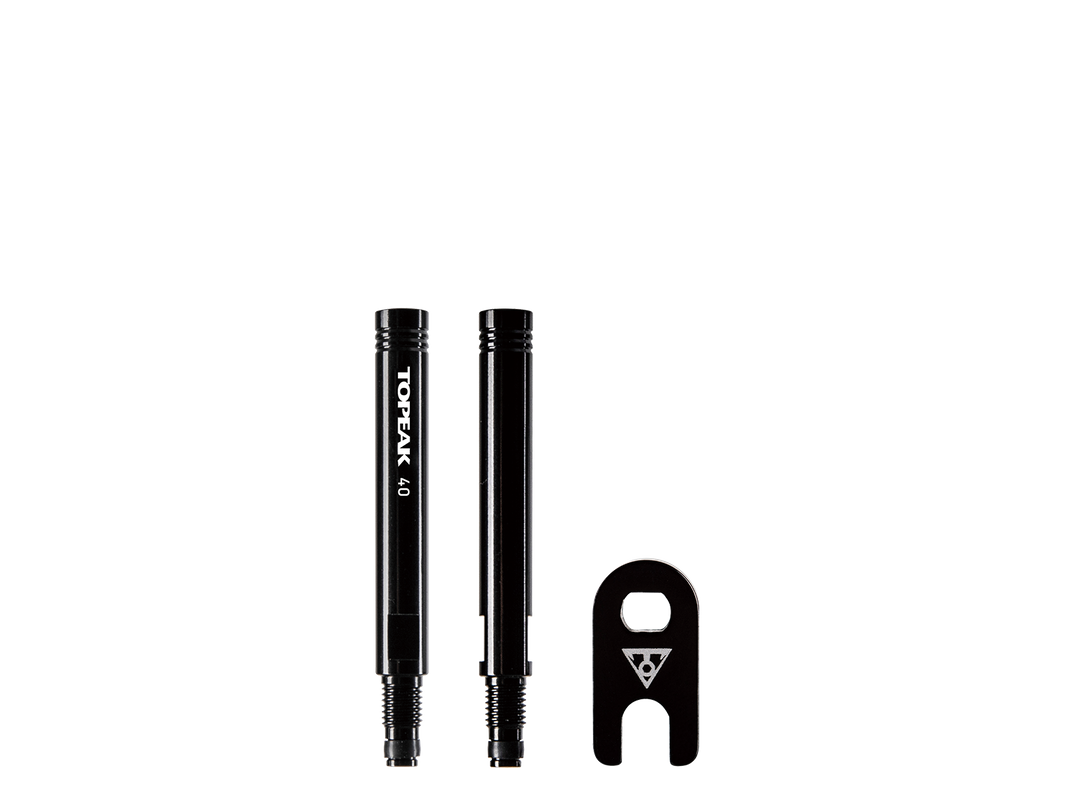 Machined from durable aircraft grade aluminum alloy to conveniently extend length of two-piece type Presta valves by 40mm to aid inflation. Durable aluminum alloy valve tool is designed to easily tighten or remove two-piece type Presta valve cores and valve extenders.