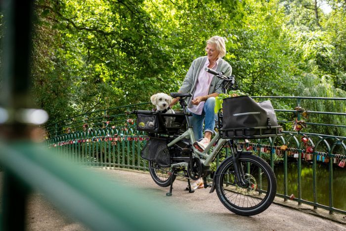 The Soft Crate Mini is a detachable dog and cargo carrier for the HSD, Short Haul (confidential), and Quick Haul, and GSD. It requires the Clubhouse Mini for installation. The Soft Crate Mini is specially designed to help riders carry small- to medium-sized dogs safely and comfortably, especially when paired with the Dog Roof Mini. The Soft Crate Mini includes pup-friendly features like mesh panels and built-in safety tethers that attach to your dog's harness. It also lets riders tote groceries and other everyday cargo with ease.