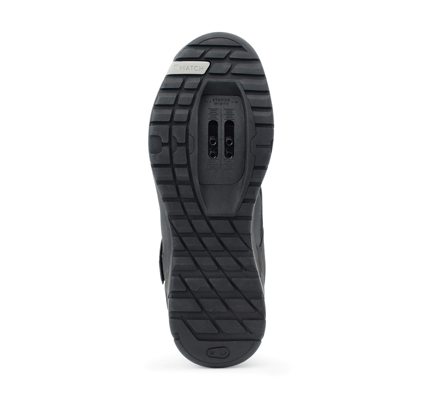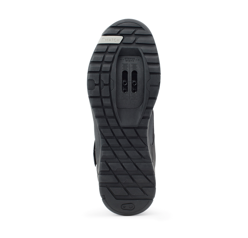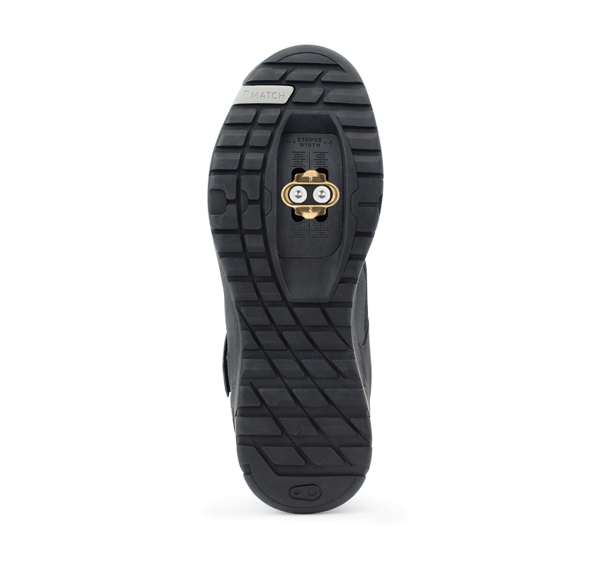 The ramped Match cleat box offers easy front and rear pedal entry and mud shedding. An extra stiff carbon-injected nylon shank transfers power efficiently when climbing or sprinting.