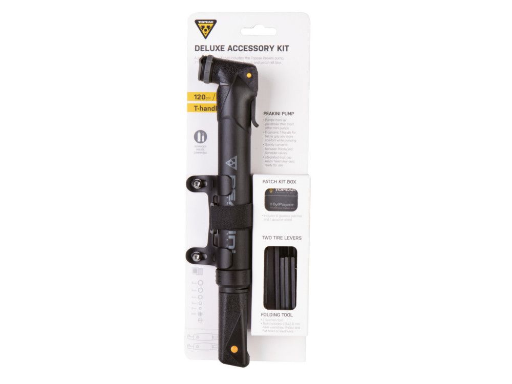 The small air pump is compatible with Auto and Presta valves. The folding T-handle makes working with it very comfortable. To avoid dirt in the pump head, it has a small dust cap. For transport, it can be attached to hand next to the bottle holder.