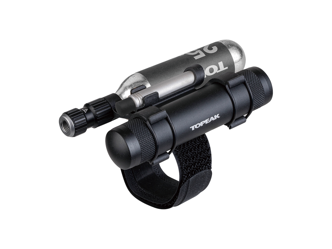 A complete tubeless tire repair / CO2 inflation kit for mountain bikes. Tubeless repair tools are integrated into the pod end caps that feature knurled surfaces delivering extra grip when repairing tires. Included three tire plugs store inside a machined alloy pod, knife with holder and a Nano AirBooster with 25g CO2 cartridge secures to a mounting module that can be strapped to a frame tube or seatpost.