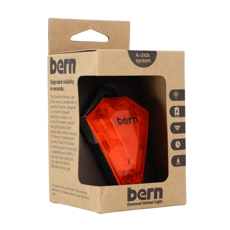 The Diamond Helmet Light is the perfect complement to many Bern helmets (Excluding the Major, Watts 2.0, Hudson, Tigre). Designed to provide increased visibility to riders of all kinds, this water resistant. tail light boasts 3 high power light modes and up to 11 hours of runtime at 6.6 lumens. Plus, its intuitive mounting system allows you to upgrade your visibility in seconds. Stay stylish and stay seen with Bern's Diamond Helmet Light.