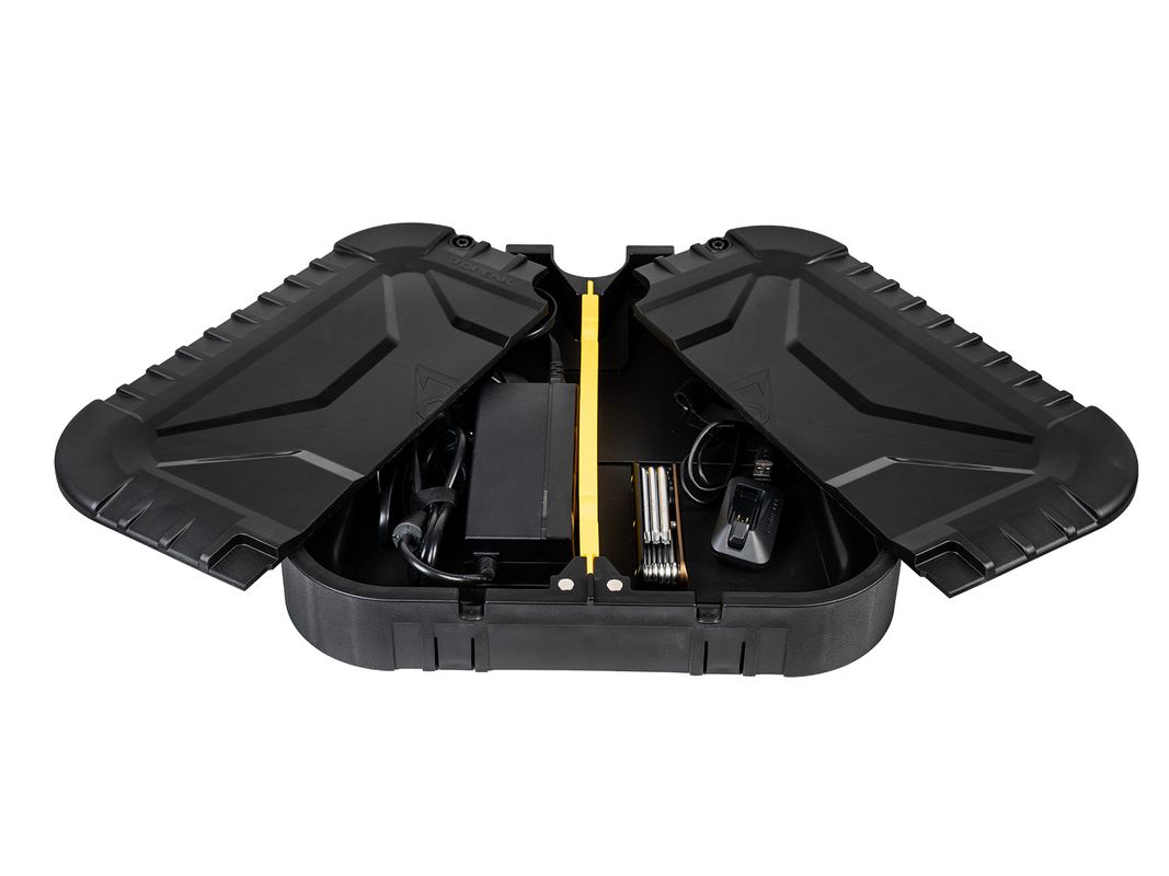 The TUNE-UP BOX is a storage container designed to store E-BIKE charging cables and electronic shifter charging docks and cables. It can be integrated with TUNEUP STAND, TUNE-UP STATION series and FLASHSTAND® MX.