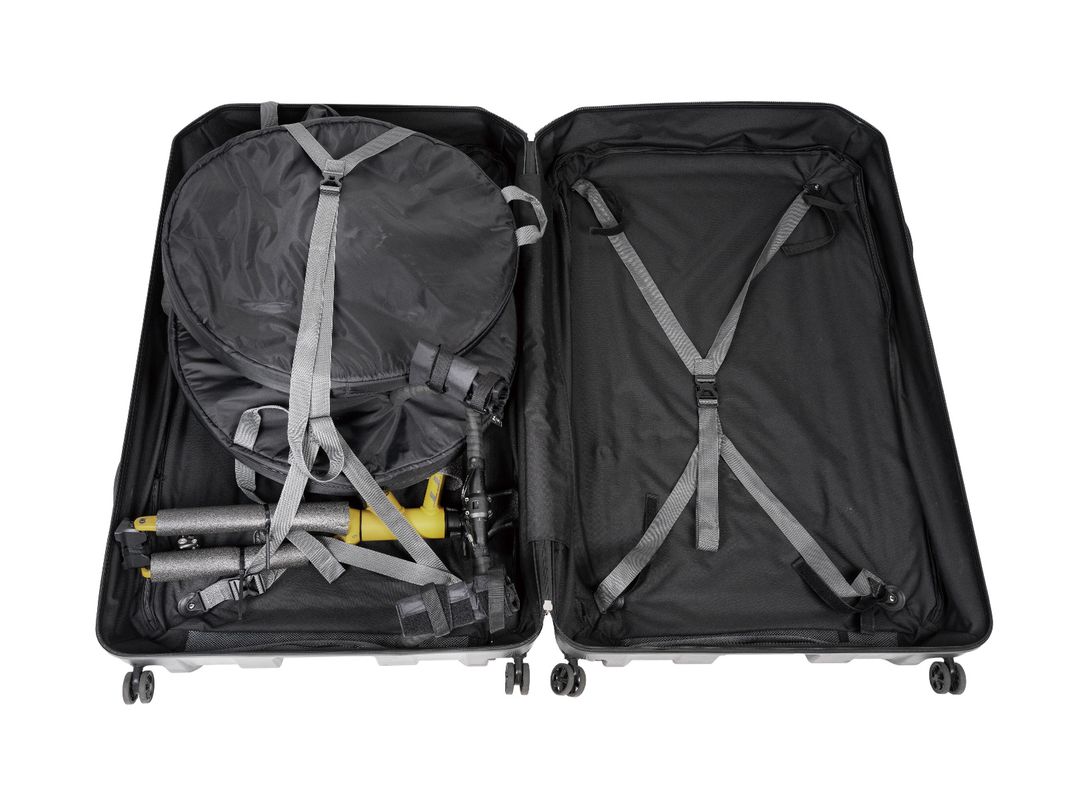Featuring high-impact strength, lightweight and flexible, Makrolon® polycarbonate shell. The upright case design with four large ø60mm multi-directional wheels allows luggage-like ease when rolling and includes carry handles for easy transport. Protective sleeves and a drivetrain cover provide protection against scratches and grease stains, while inner pockets help keep your gear organized all the way to your final destination.