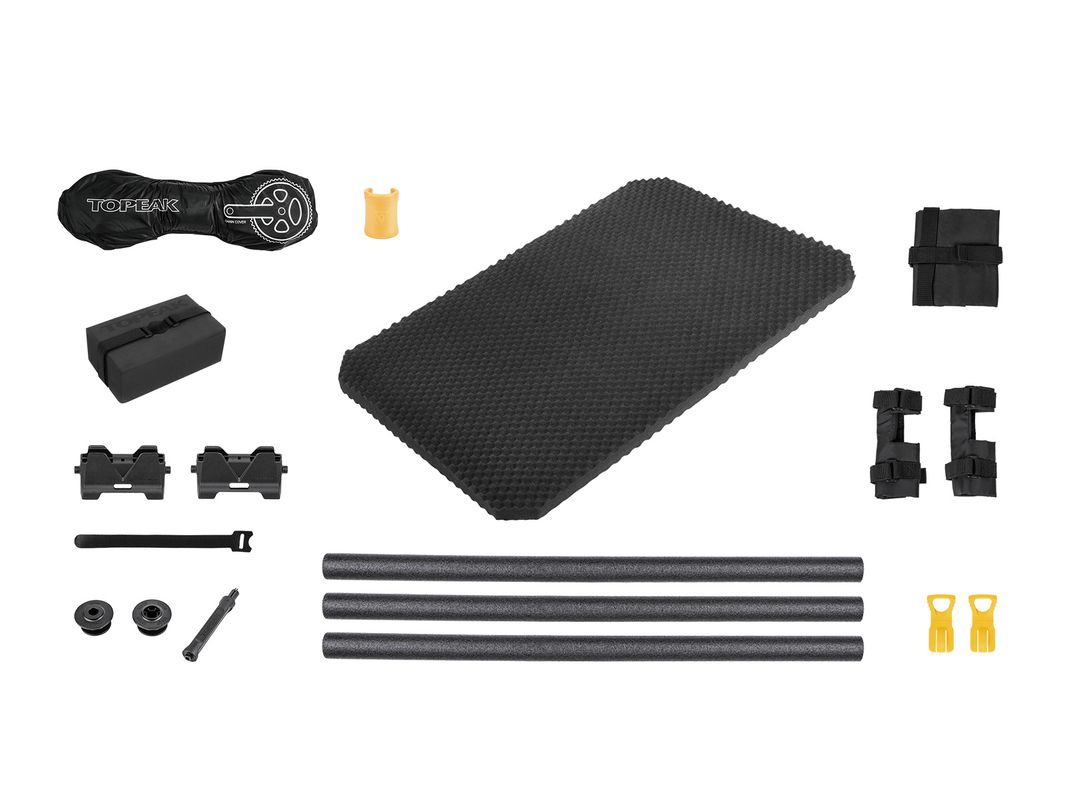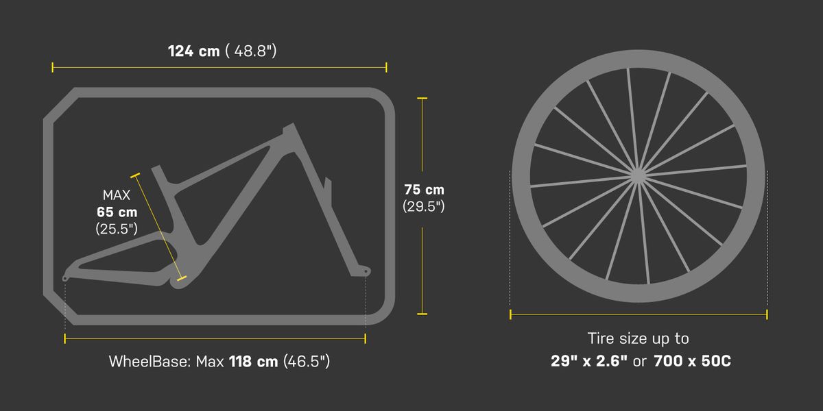 | ADDED FEATURES | Upright case design, Carry handles, Four large ø60mm multi-directional wheels, Inner pockets Includes Drivetrain cover and Protective sleeves for frame tubes and fork blades |