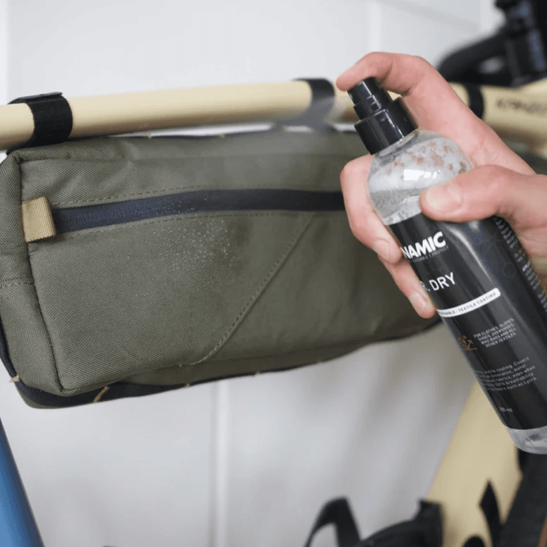 Soaked bib-shorts suck, so does an awesome jacket that is no longer waterproof. Finding your clean clothes all wet in your bikepacking bag wet is not great either. Meet Dr. Dry; a planet friendly spray-on coating that can make any textile waterproof. No more soggy bib-shorts after a rainy ride. No more leaking tents or wet bikepacking bags.