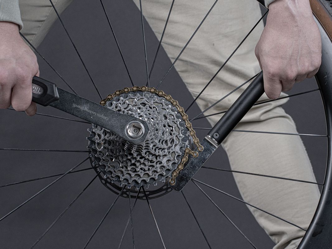 Professional-grade chain whip designed for the removal and installation of bicycle cassettes, featuring a durable and ergonomic aluminum handle. Compatible with 7-to-13-speed mountain and road bike cassettes. Precision-engineered to securely hold the cassette in place during installation and removal.