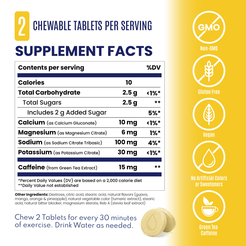 SUGGESTED USE: Chew 2 tablets for every 30 minutes of exercise. For maximum effect, chew completely before swallowing. Drink water as needed.