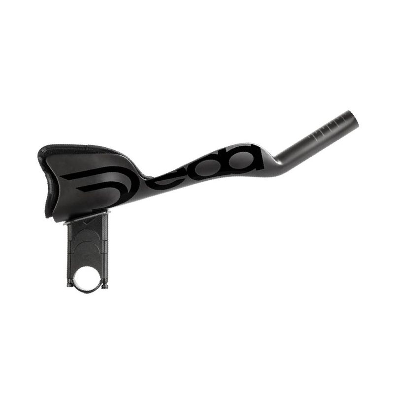 Jet clip-on are full carbon extensions especially designed and engineered for time trial and long distance triathlon races. The Jet One version is made in UD full carbon construction to get an incredible weight of 660g including all spacers. The design features ergonomic and integrated armrests that allow a full adjustability of length, width, angle and stack height. The fixing plate of the extensions on the bridge is asymmetrical and allows you to adjust the setback of a further +/- 15mm with respect to the axis of the handlebar. Jet One extensions are delivered with all necessary parts to fit Deda Tribar handlebar or any other Ø31.7 handlebar. Available in two sizes, small (340mm) and medium (370mm) with an additional 60mm of cut to length. Jet have been designed with a 15 degree angle to meet UCI rules at the maximum permitted height. The extensions are compatible with internal cable routing (only electronic groupsets) and comes with comfortable pads and an integrated mount for Garmin®, Wahoo® and Bryton®. Available in POB (polish on black) finish.